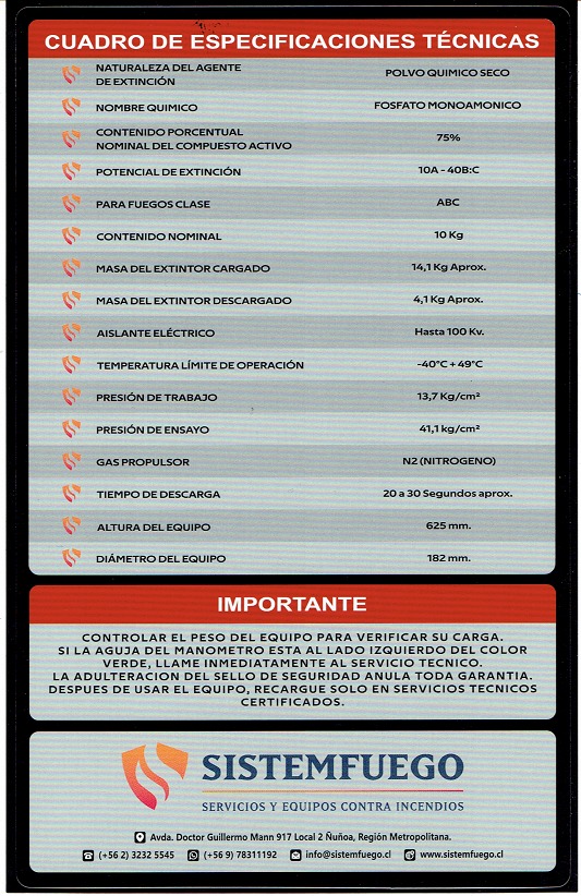 | Masa del extintor Cargado | 14.4 kg |